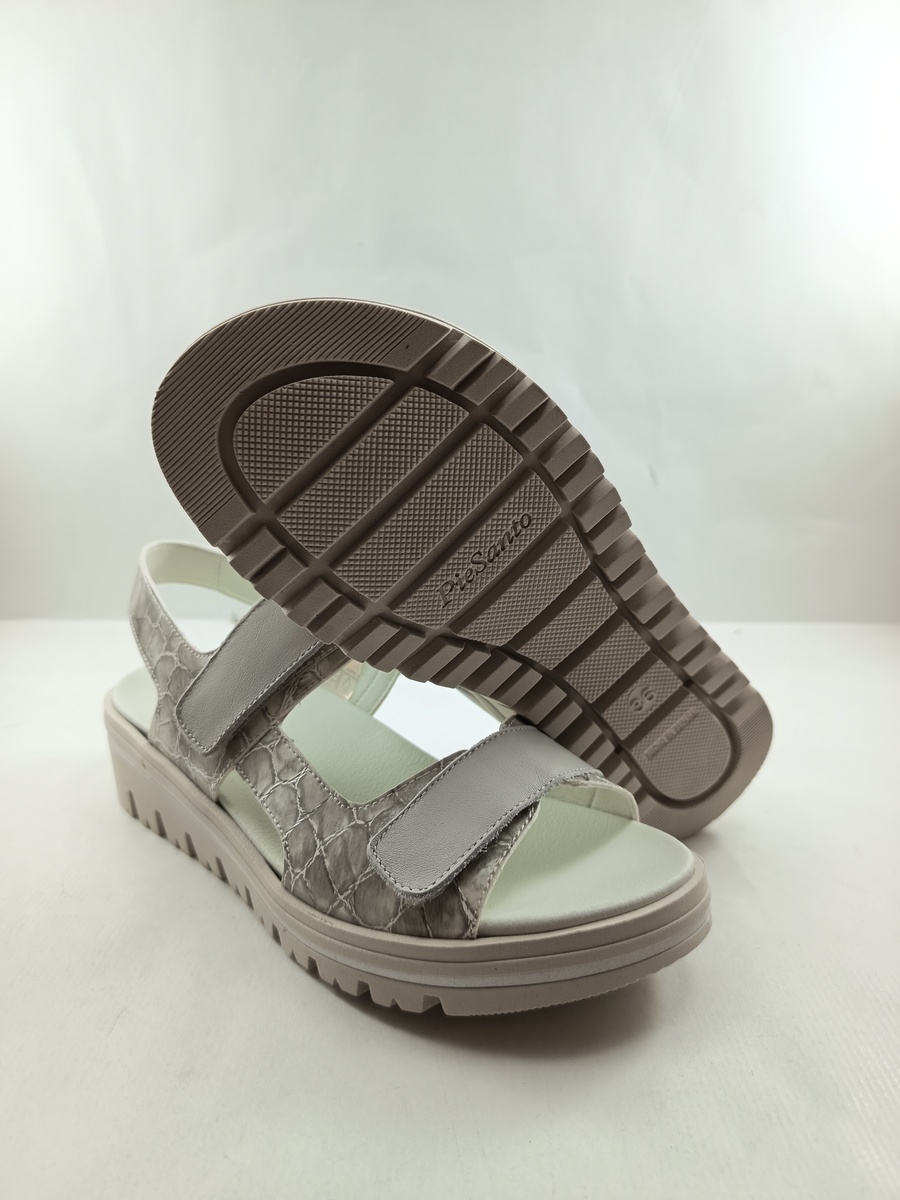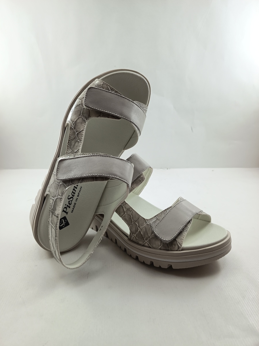 Sandalia de piel plata con cierres de velcros en tiras, forro y plantilla de piel, detalle de suela en goma, plantilla acolchada.
