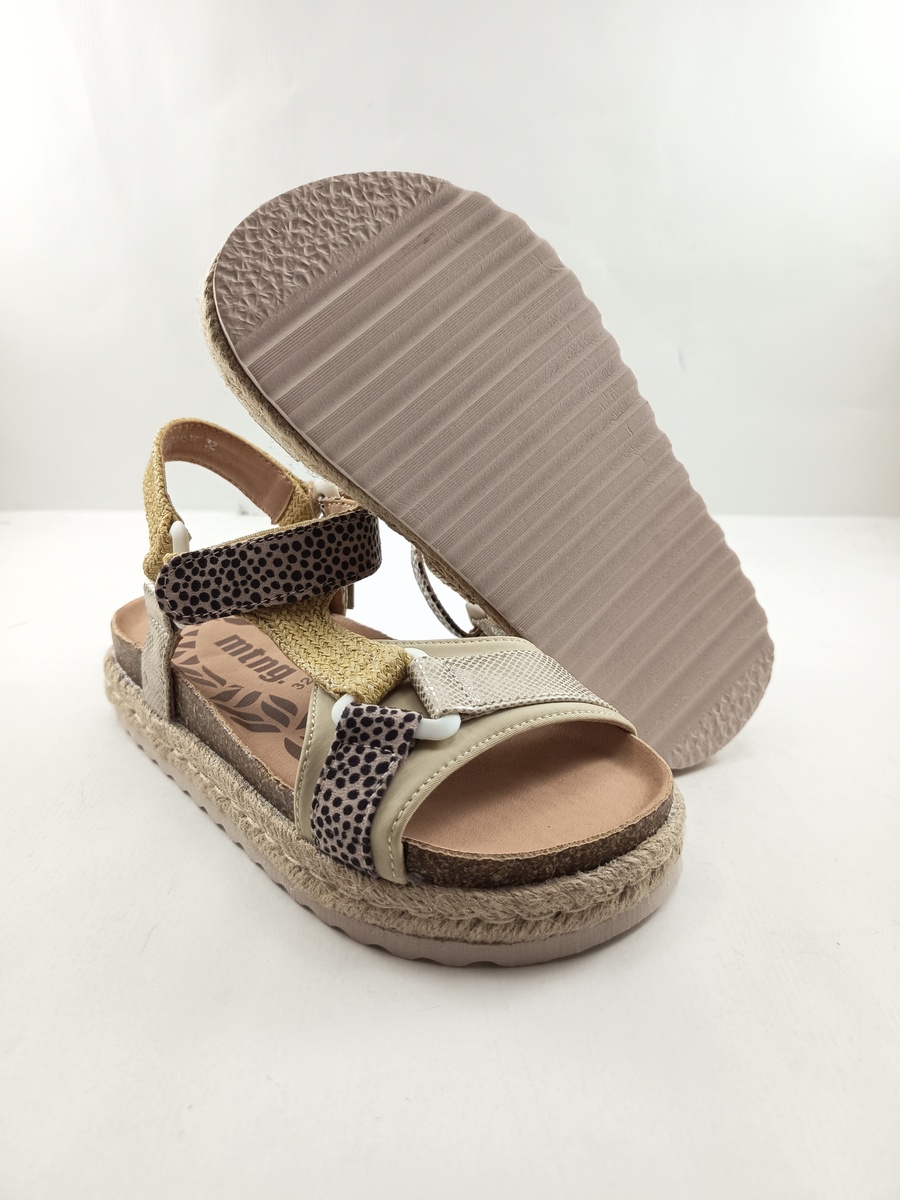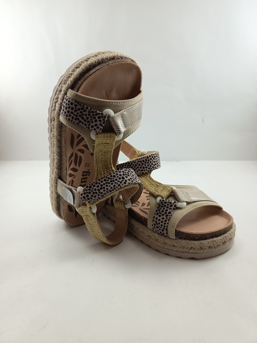 Sandalia sintetica camel con cierre de velcro y suela de goma bio, forro y plantilla de piel, detalle de animal print en tira superior y yute en tira empeine y vira.