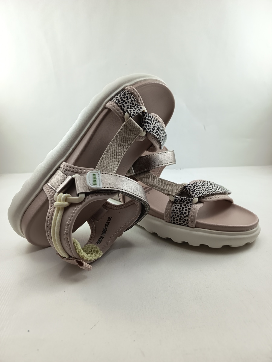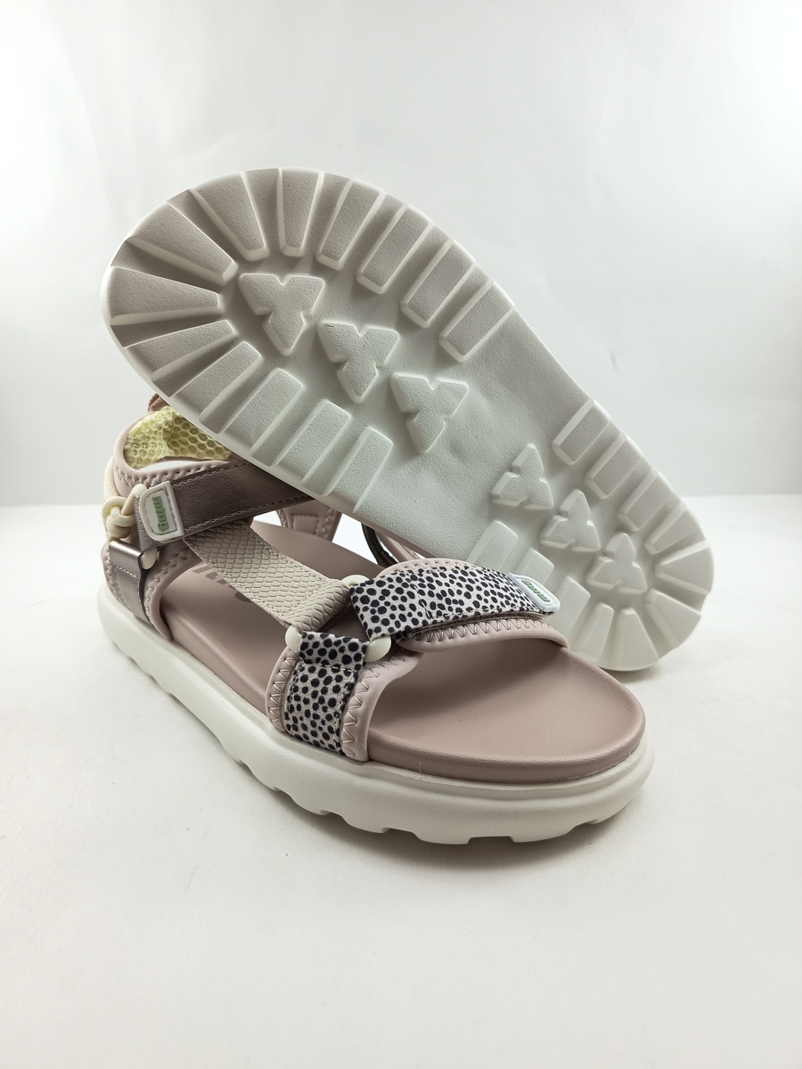 Sandalia sintetica crema con cierre de velcros y suela de goma, forro y plantilla textil, detalle de puntos en tira delantera oro en tira trasera y crema en tira empeine.