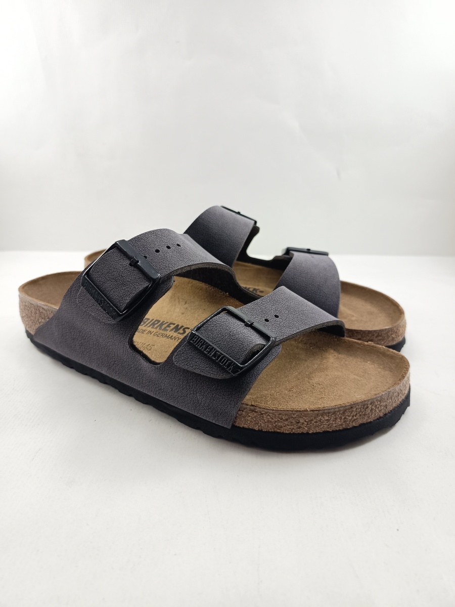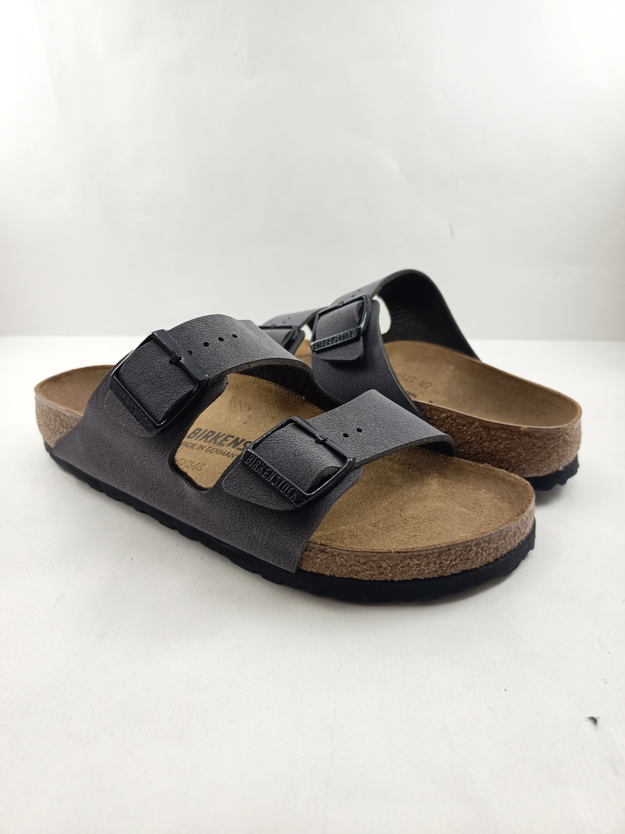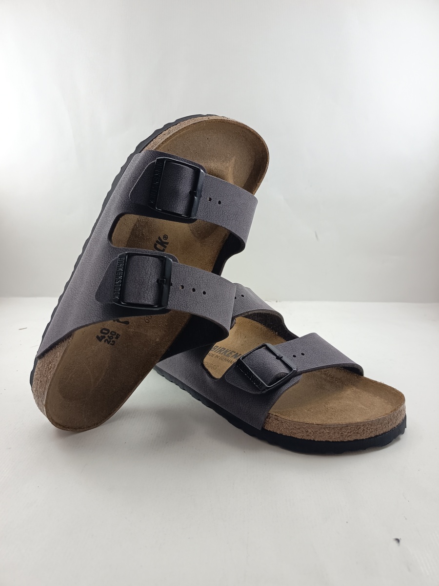Sandalia tipo chancla de piel gris con cierre de hebillas, Birkenstock mod. Arizona