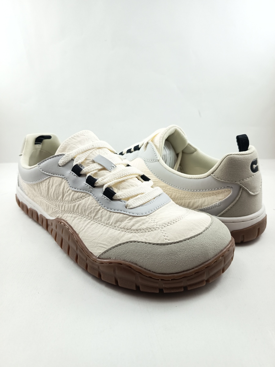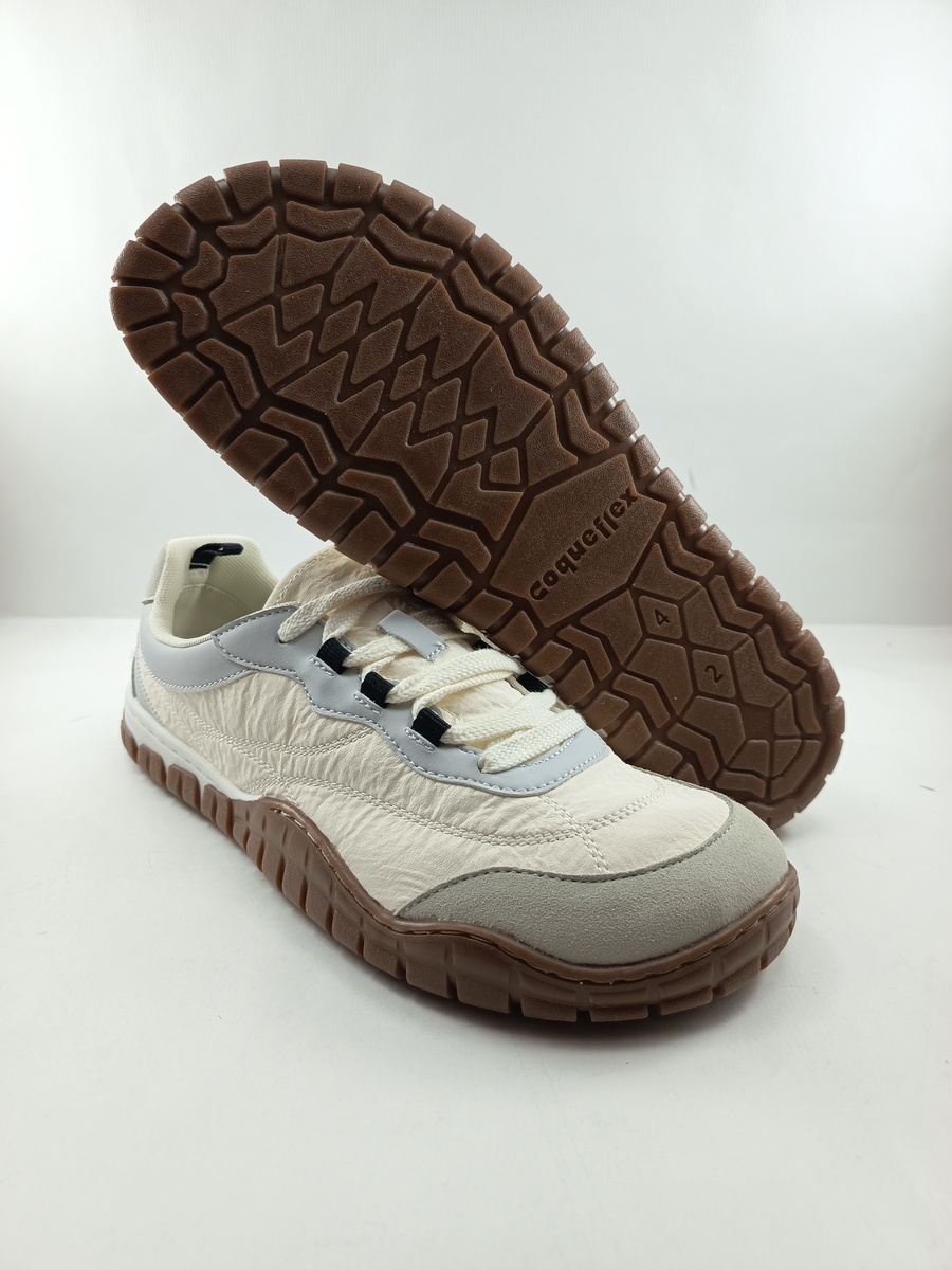 Semi-sport bareffot de piel crema con suela fina, plana y drop cero, flexible para una pisada natural y mejor alineacion de espalda, con horma ancha y anatomica (evita deformaciones), sin contrafuerte y plantilla extraible.