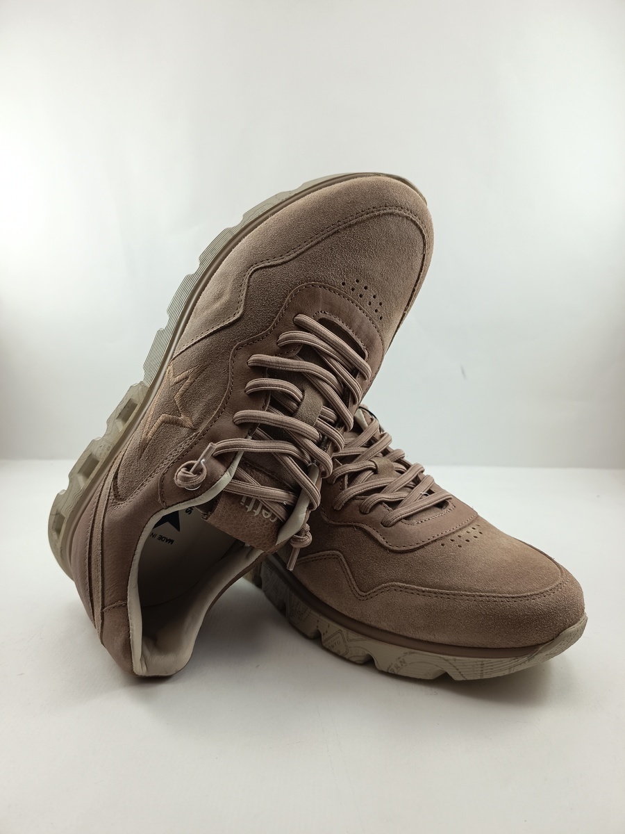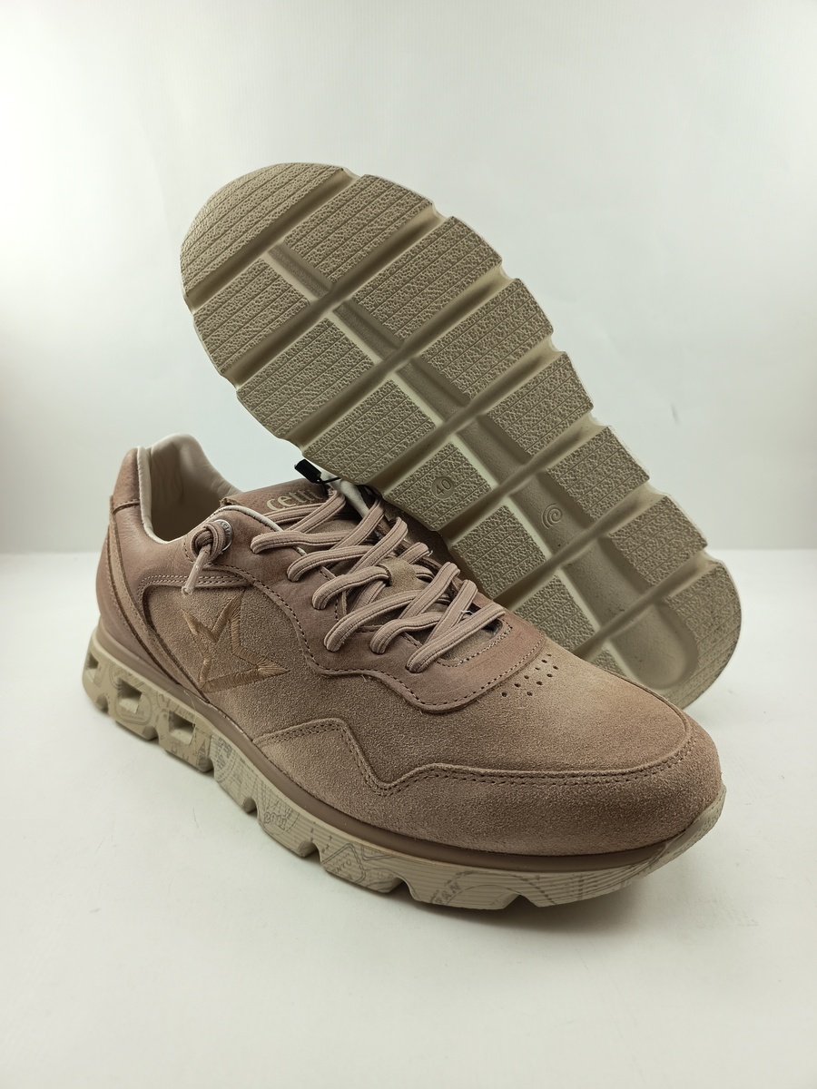 Semi-sport de ante marron y suela de goma robusta y dentada, plantilla de piel extraible, detalle de suela en color crema.