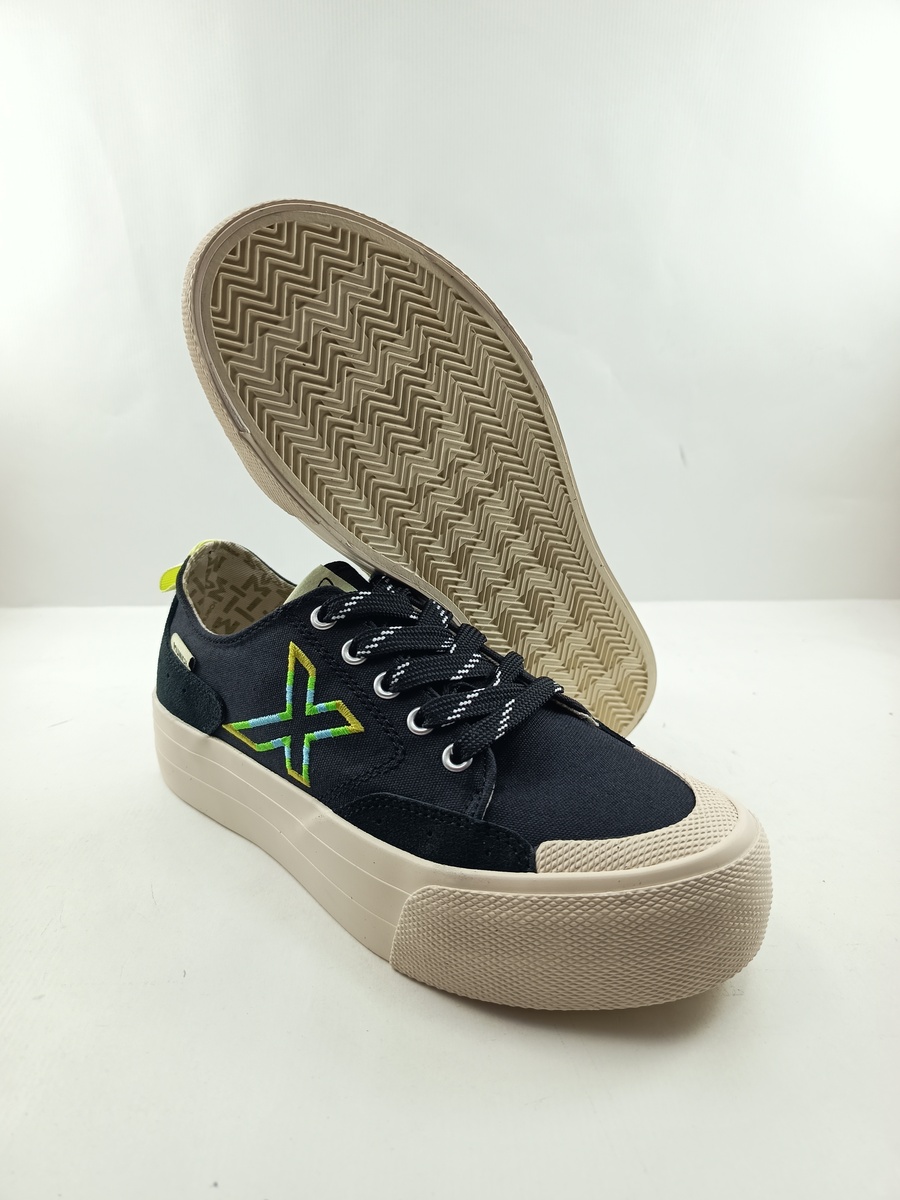 Semi-sport de lona negra con cierre de cordon y suela de goma, forro y plantilla sintetica, detalle de suela con plataforma y blanca.