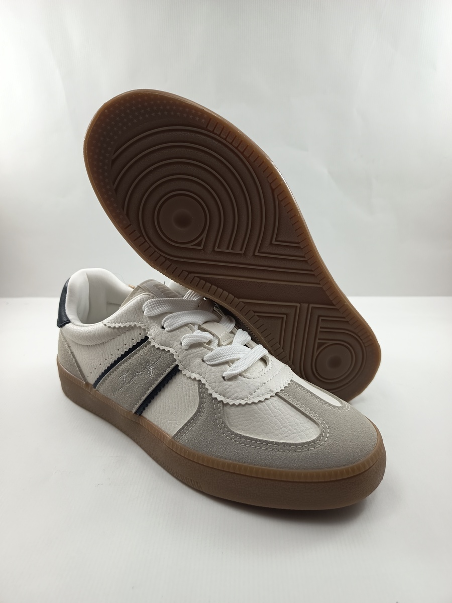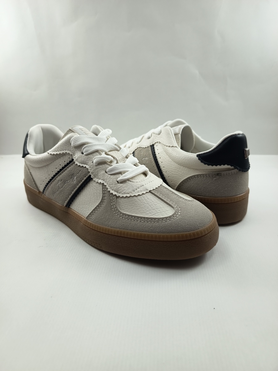 Semi-sport de piel blanca con cierre de cordon y suela de goma, forro y plantilla textil, detalle de acabados en gris y negro.