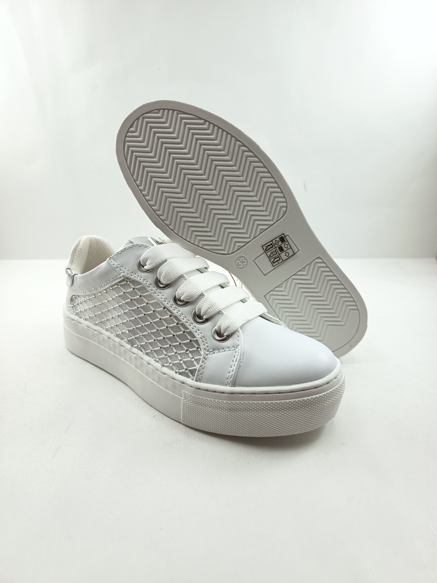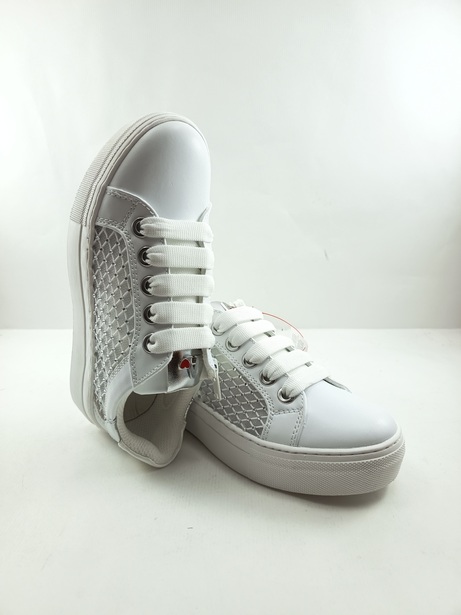 Semi-sport de piel blanca con cierre de cordon y cremallera, suela de goma, forro textil y plantilla de piel, detalle de brillos en lateral exterior.