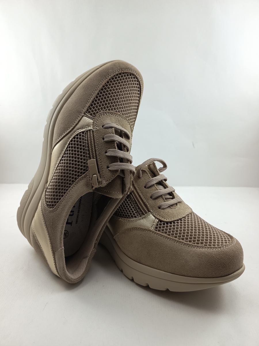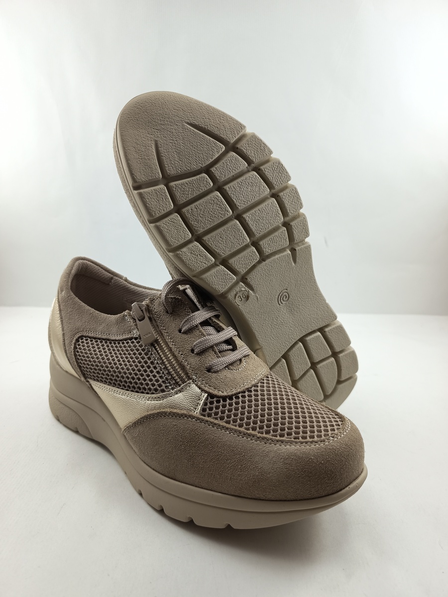 Semi-sport de piel camel con cierre de cordon y suela de goma, forro y plantilla de piel, detalle de acabados en oro y rejilla en dedos.