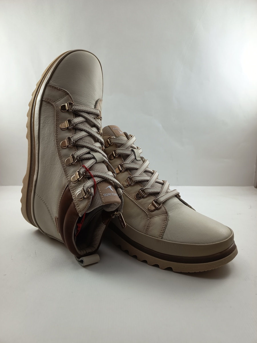 Semi-sport de piel crema con cierre de cordon en empeine y suela de goma, forro y plantilla de piel, detalle de cuello en cuero.