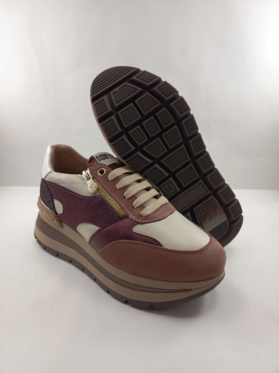 Semi-sport de piel granate con cierre de cordon y cremallera, suela de goma, forro y plantilla textil, detalles de acabados en blanco.