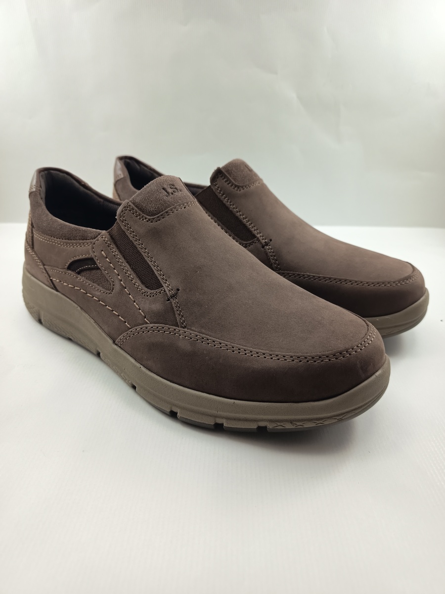 Semi-sport de piel marron sin cierres y goma elastica, suela de goma, forro y plantilla de piel.