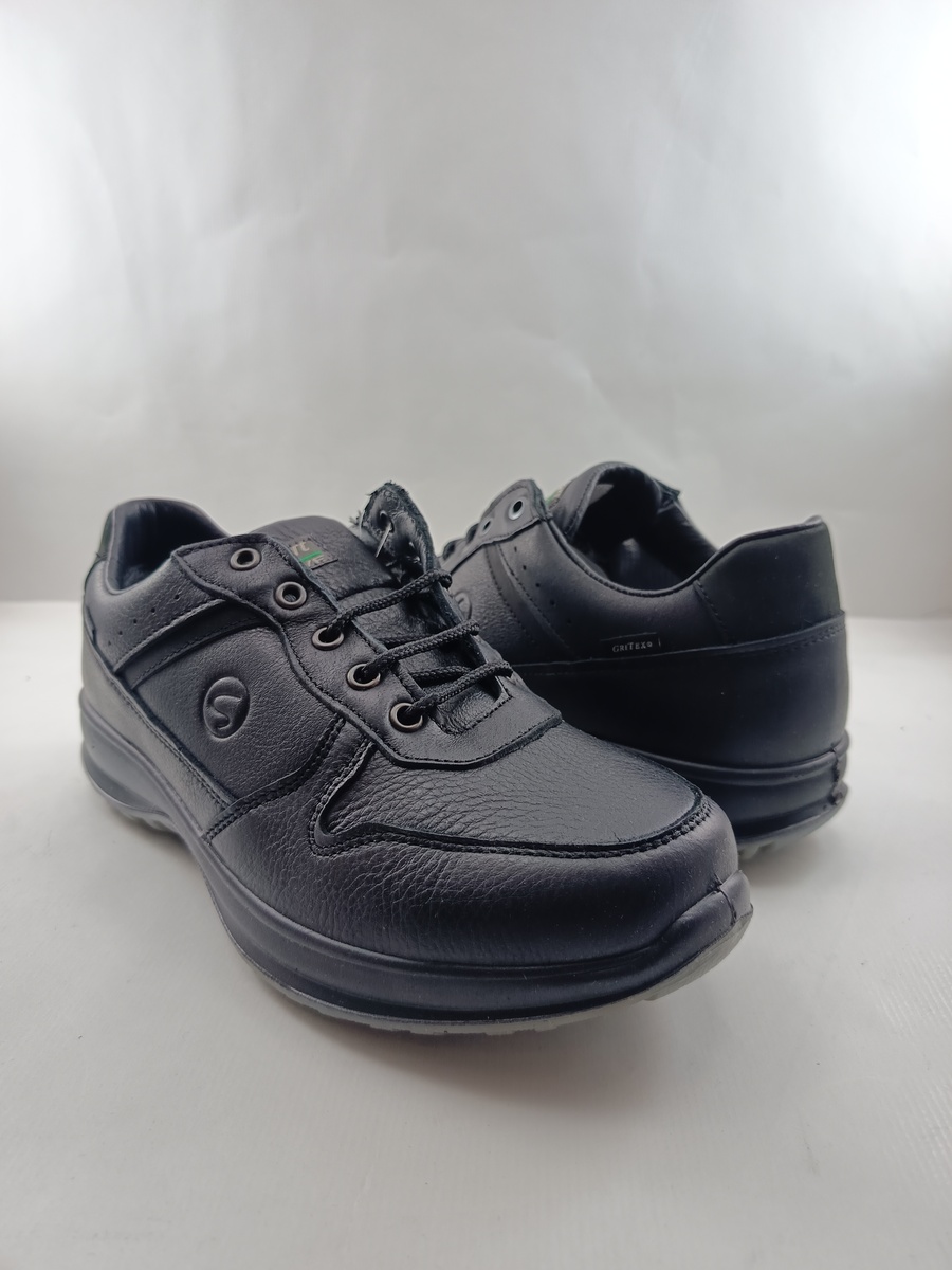 Semi-sport gore-tex de piel negra con cierre de cordon y suela de goma, forro y plantilla de piel, detalle de repuntes en acabados.