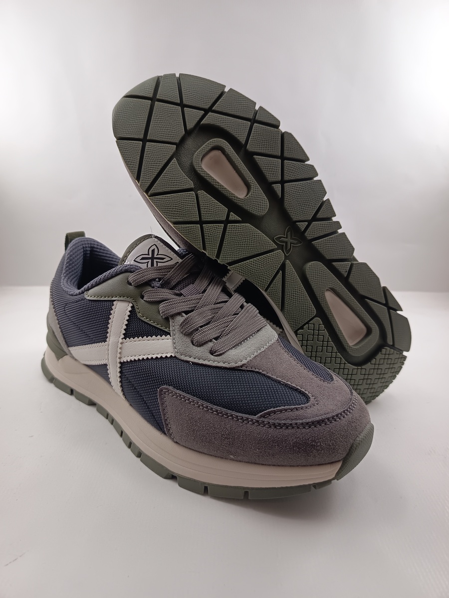 Semi-sport de piel negra con cierre de corddon y suela de goma, forro y plantilla textil, detalles de acabado en gris y verde.
