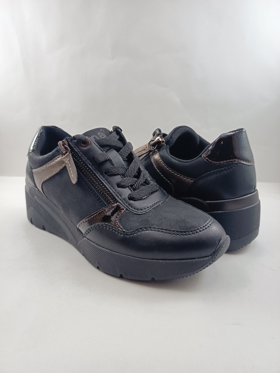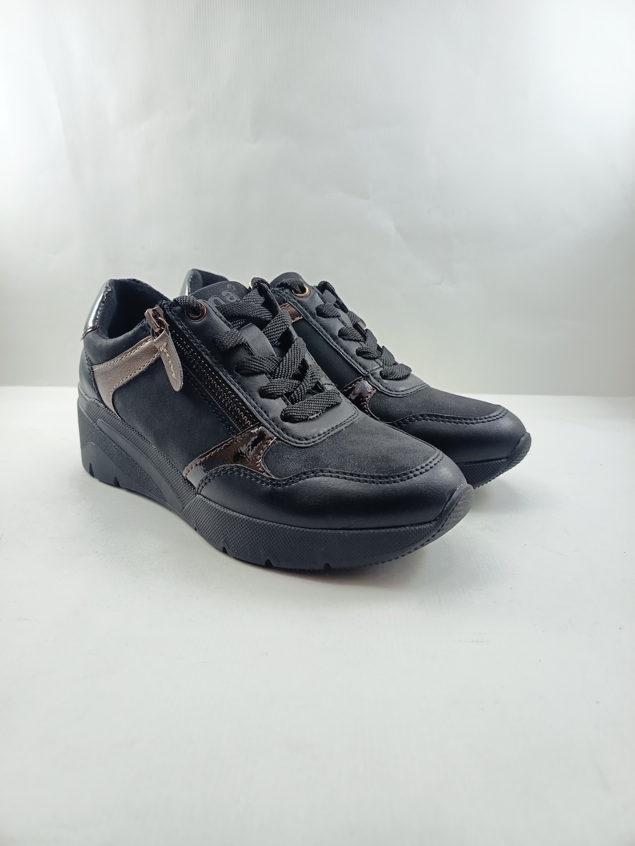 Semi-sport de piel negra con cierre de cordon y cremallera, suela de goma con cuña de 2, forro y plantilla textil, detalle de tira dorada en lateral exterior.