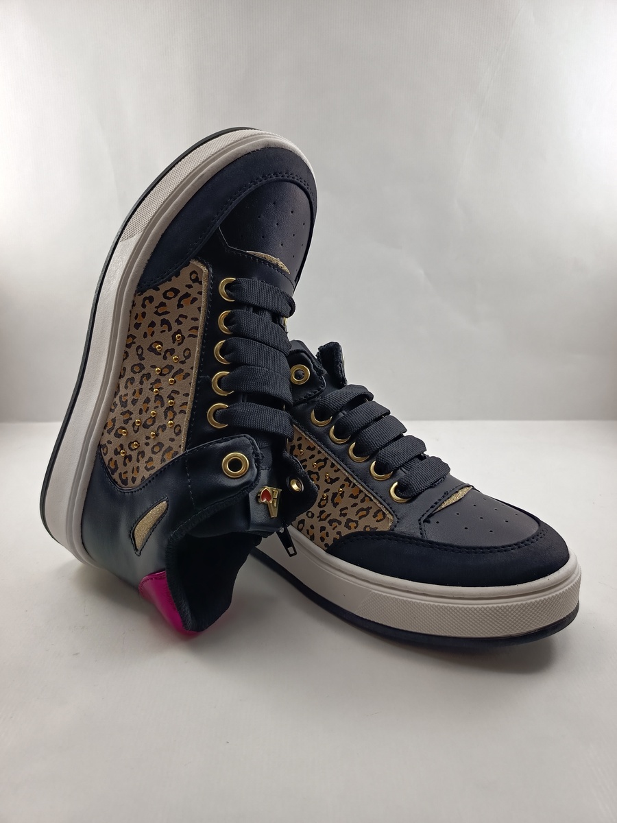 Semi-sport de piel negro con cierre de cordon y suela de goma, forro y plantilla textil, detalle de animal print en lateral.