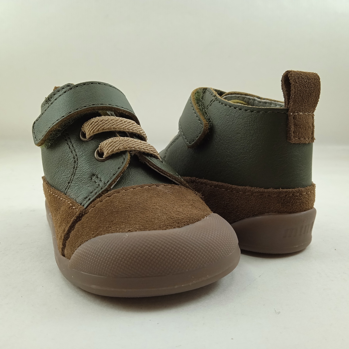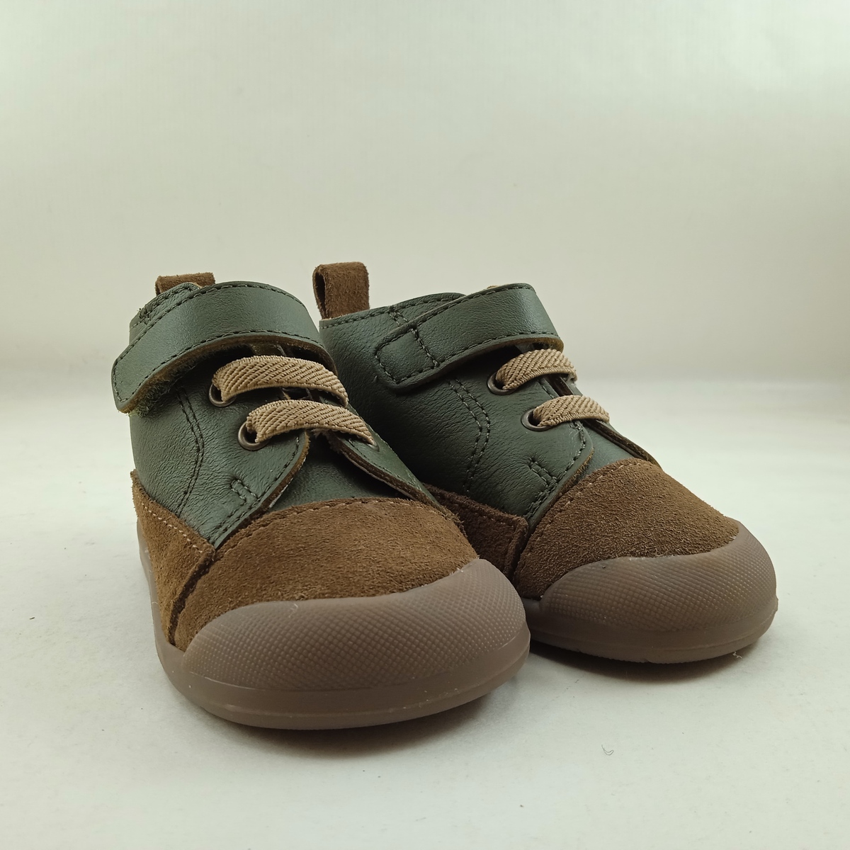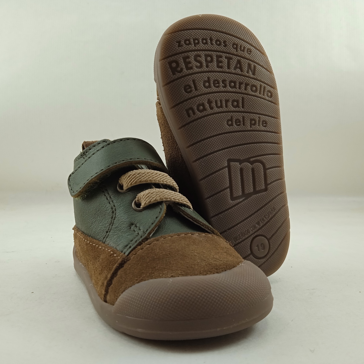 Semi-sport de piel verde con cierre de velcro en tobillo y suela de goma, forro y plantilla de piel, detalle en camel en empeine.