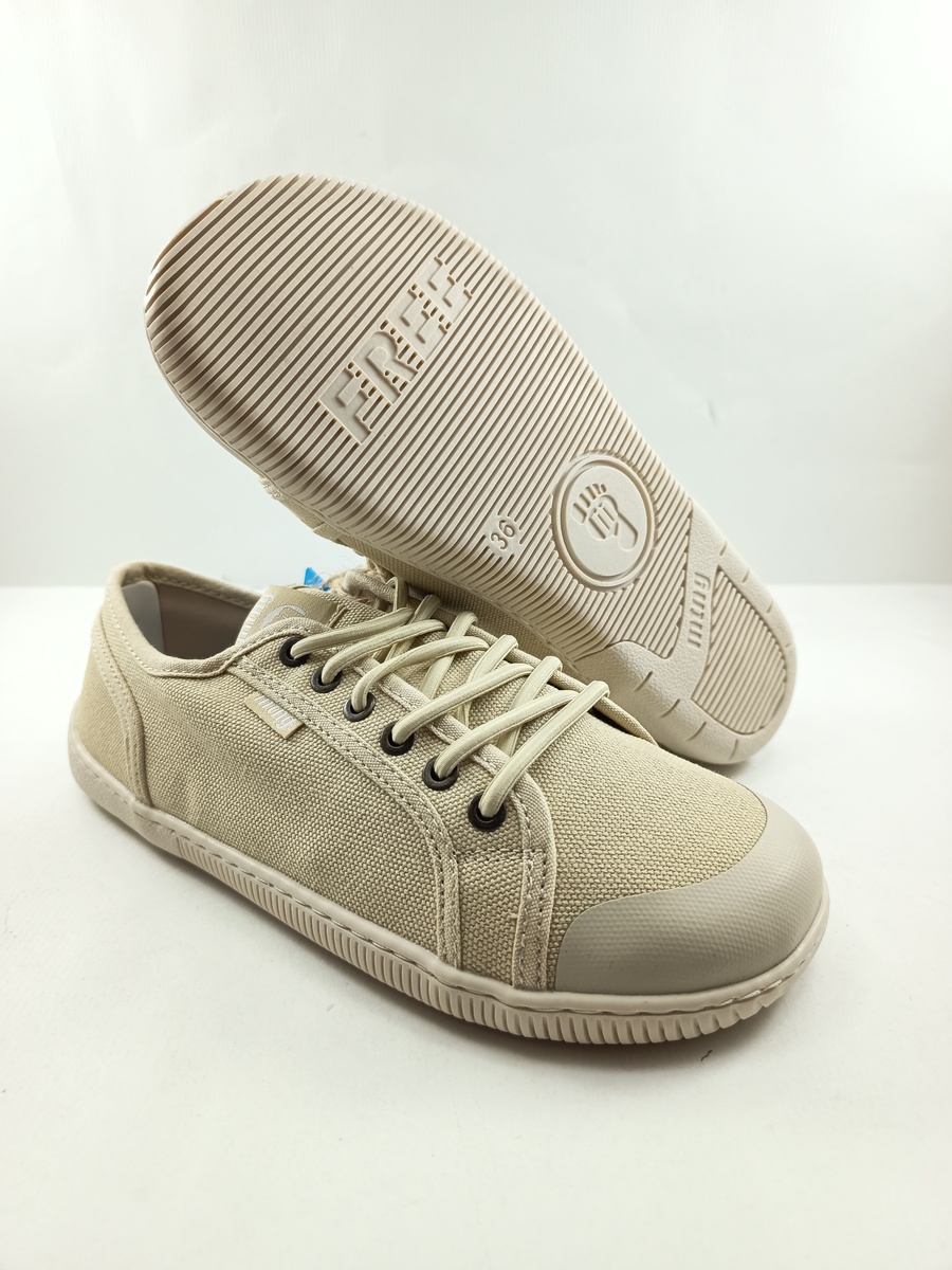 Semi-sport de lona camel con cierre de cordon y suela de goma, forro y plantilla textil, modelo barefoot.
