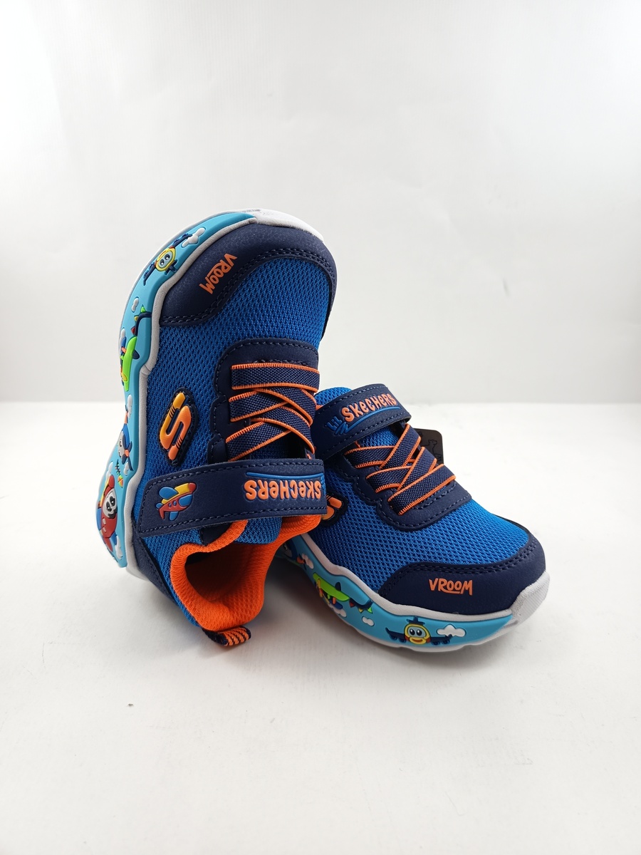 Semi-sport sintetico azul con cierre de velcro y suela de goma, forro y plantilla textil, detalle de aviones en vira suela.