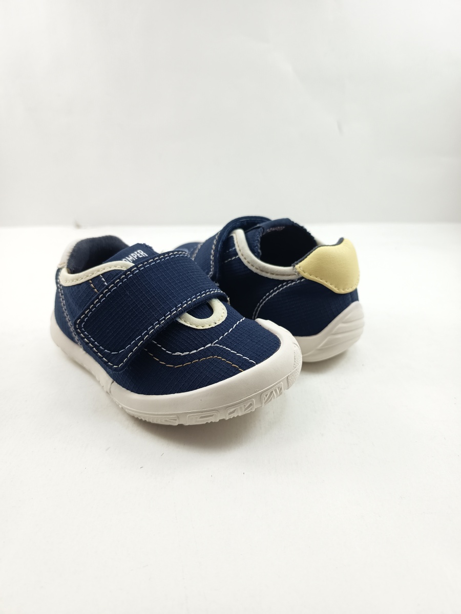 Semi-sport sintetico azul marino con cierre de velcro y suela de goma, forro y plantilla textil, detalle de pespunte en blanco visto.