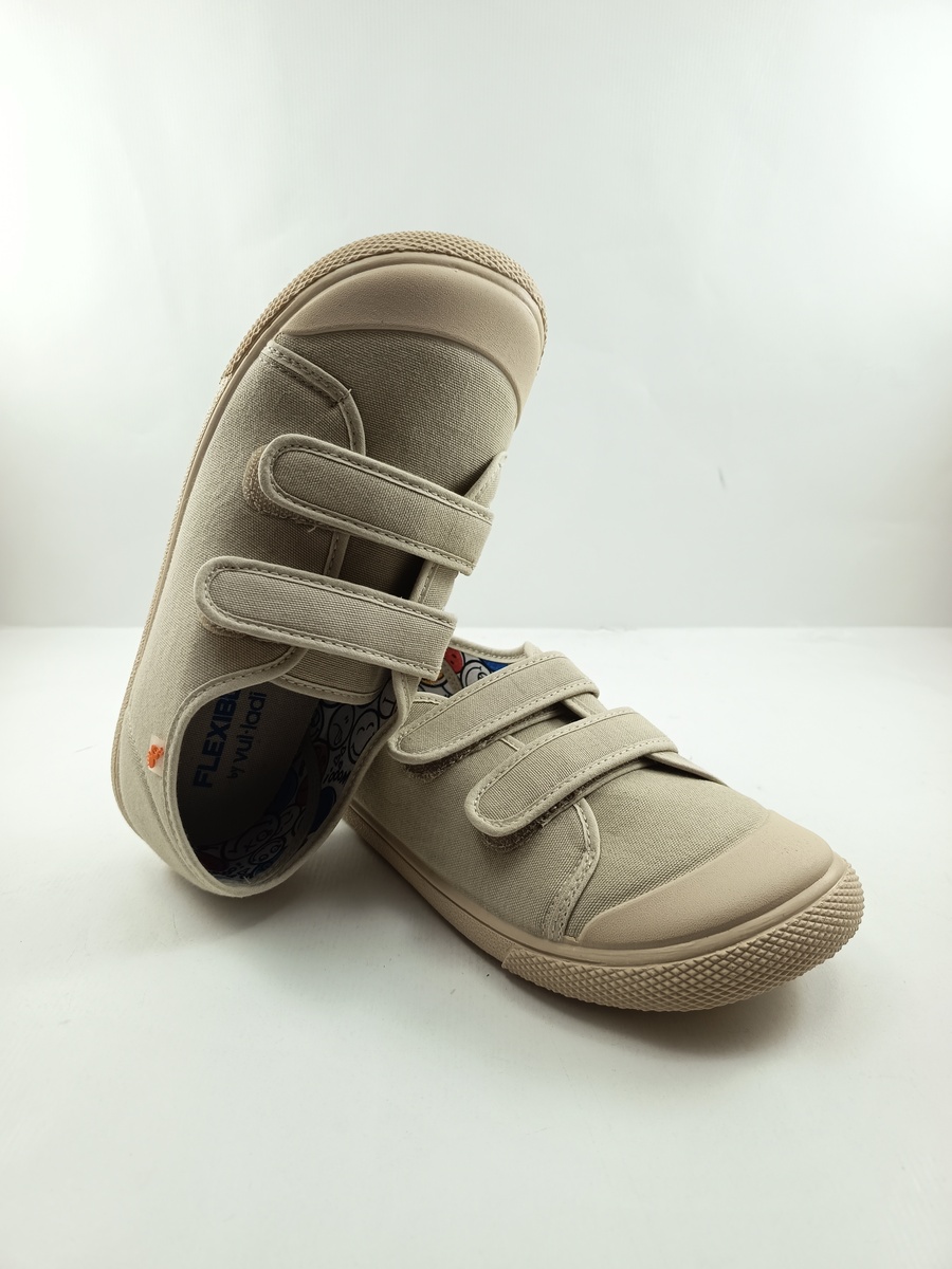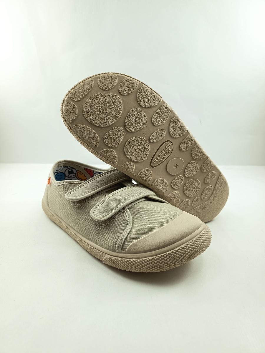 Semi-sport sintetico beig con cierre de doble velcro y suela de goma, forro y plantilla textil, detalle de suela y puntera blanca.