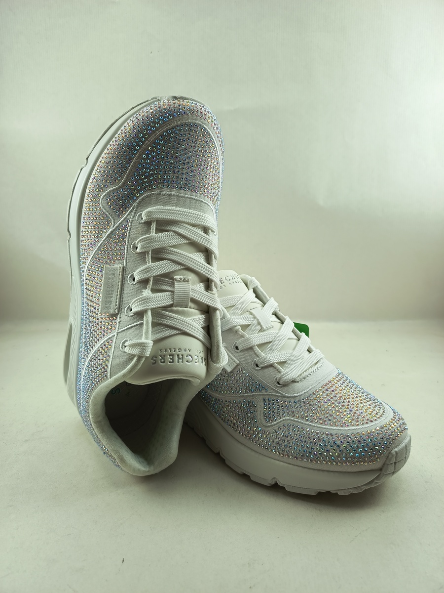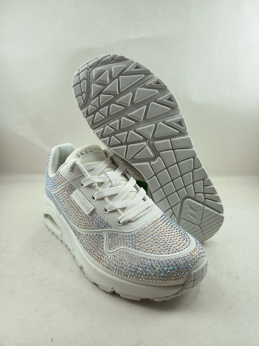 Semi-sport sintetico blanco con cierre de cordon y suela de goma, forro y plantilla textil, detalle de brillos en todo el zapato, modelo street.
