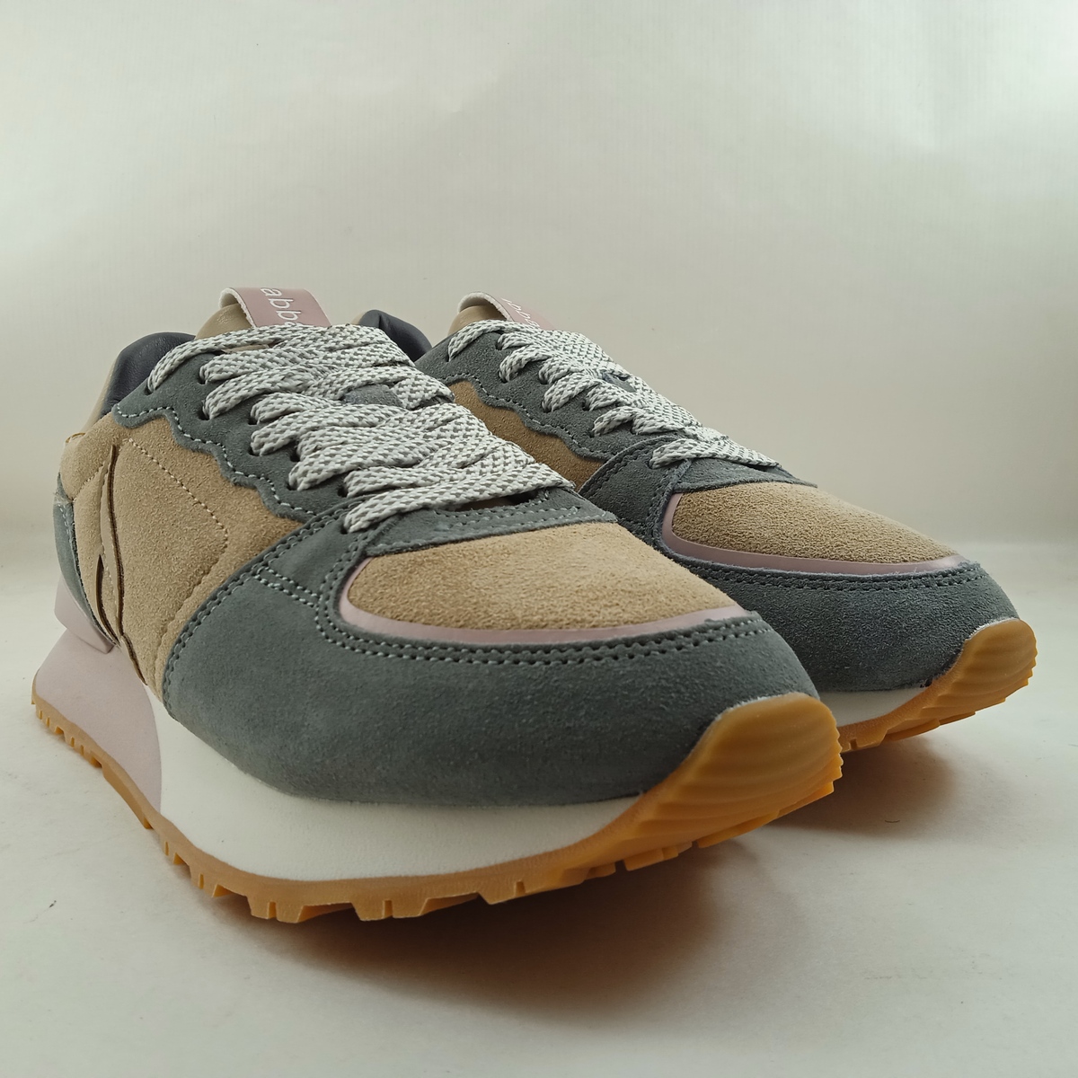 Semi-sport sintetico combinado en gris y camel con cierre de cordon en empeine central y suela de goma, detalle en suela y cordon blanco.