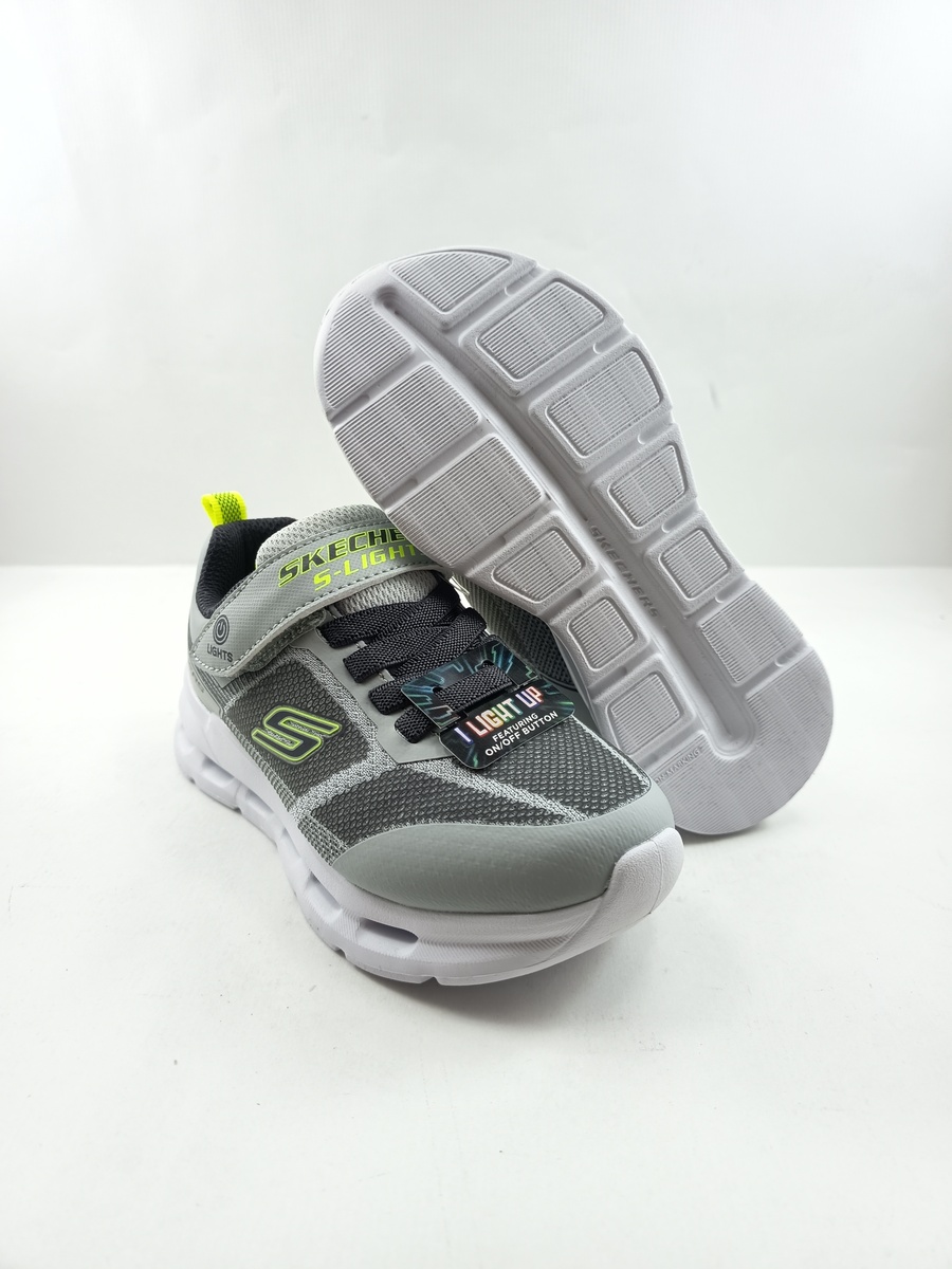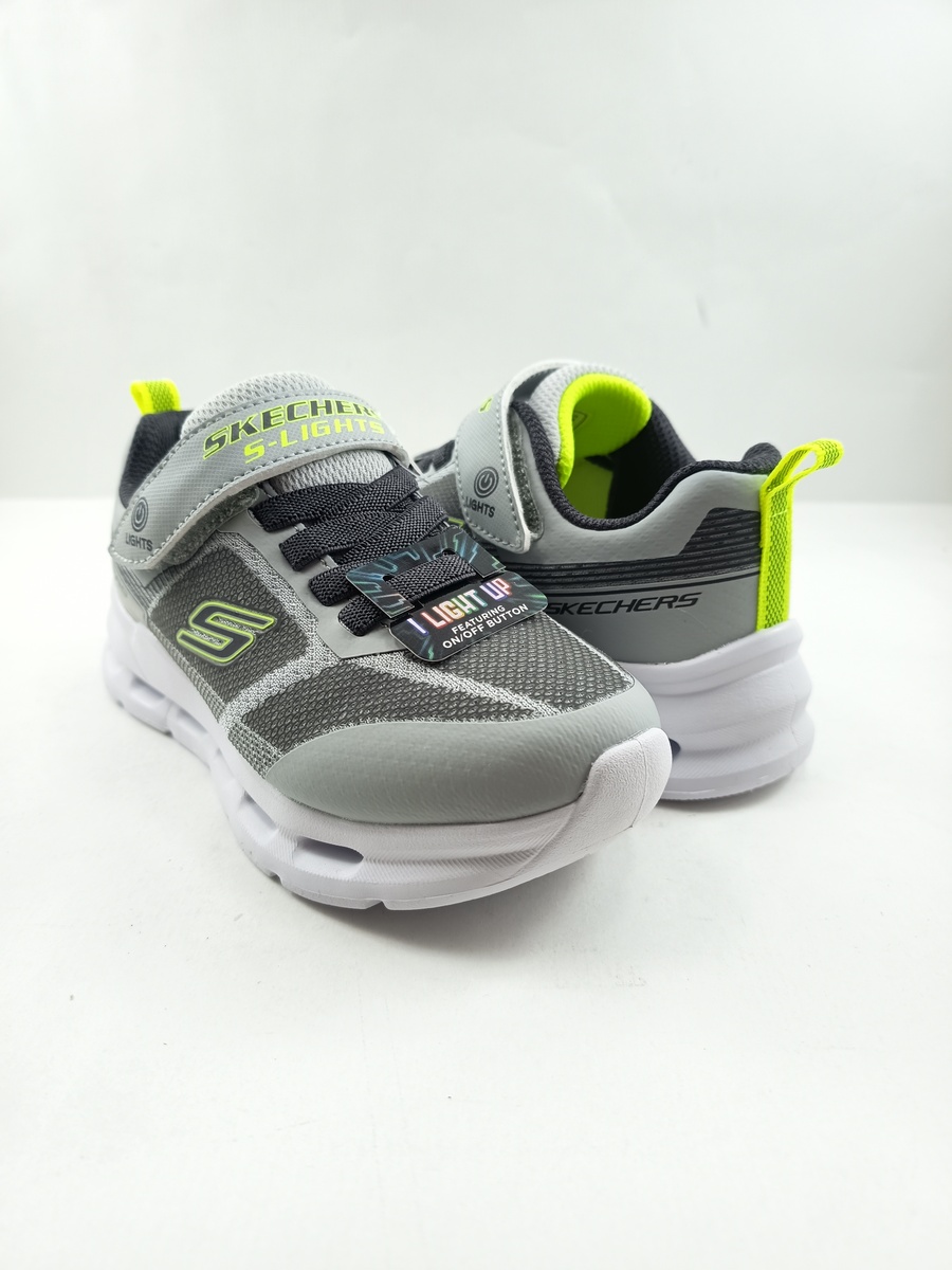 Semi-sport sintetico gris con cierre de velcro y suela de goma, forro y plantilla textil, detalles de acabados en neón y luces en suela.