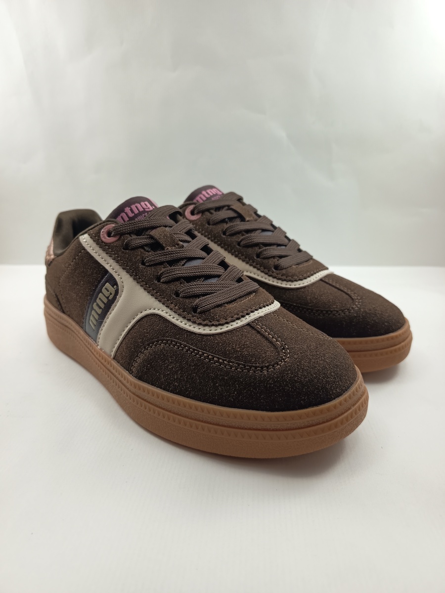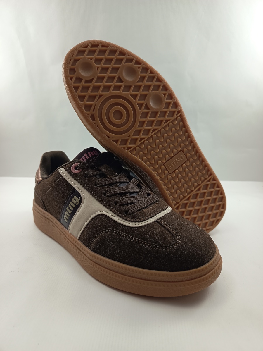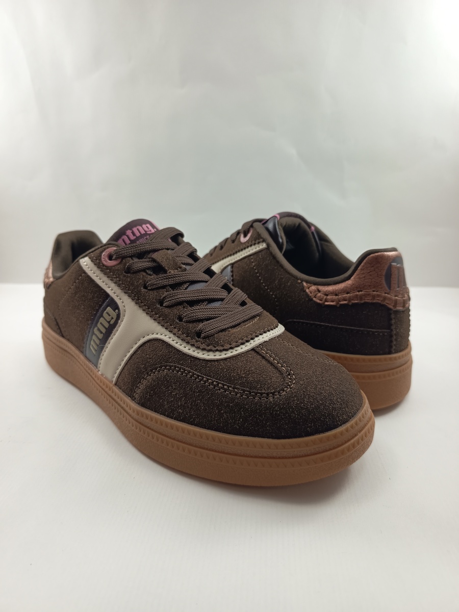 Semi-sport sintetico marron con cierre de cordon y suela de goma, forro y plantilla textil, detalle de pieza blanca en lateral exterior.