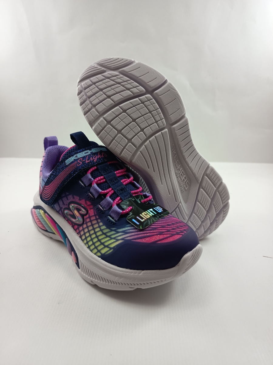 Semi-sport sintetico multicolor con cierre de velcro y suela de goma, forro y plantilla textil, detalle de luces en suela.
