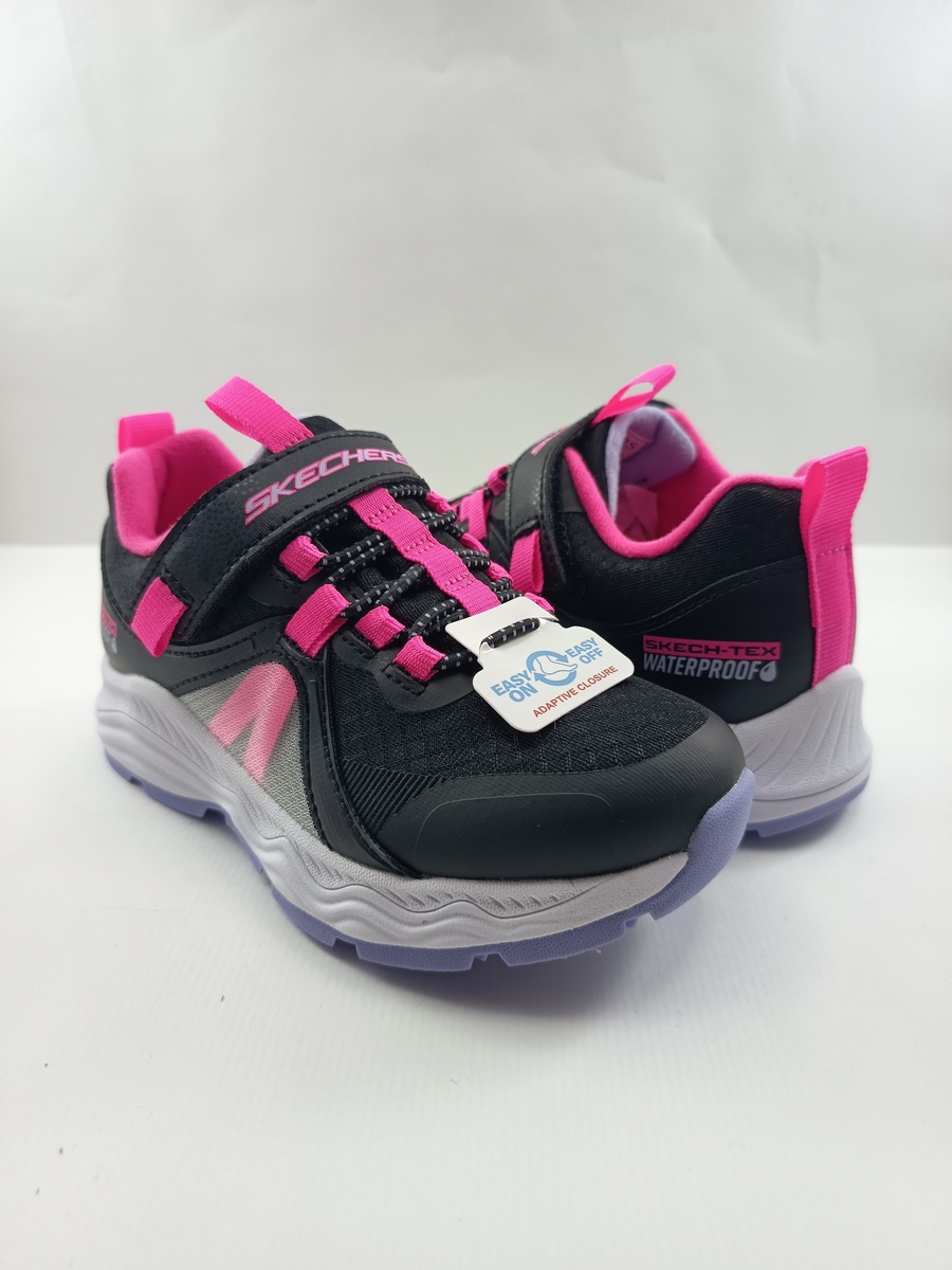 Semi-sport sinteitco waterproof negro con cierre de velcro y suela de goma, forro y plantilla textil, detalles de acabado en fuxia.