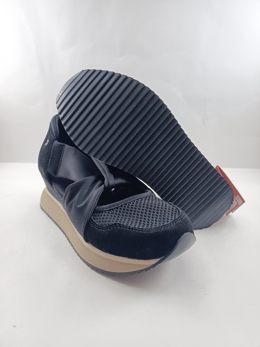 Semi-sport sintetico negro sin cierres y suela de goma con cuña de 2, forro y plantilla sintetica, detalle de suela en blanco.