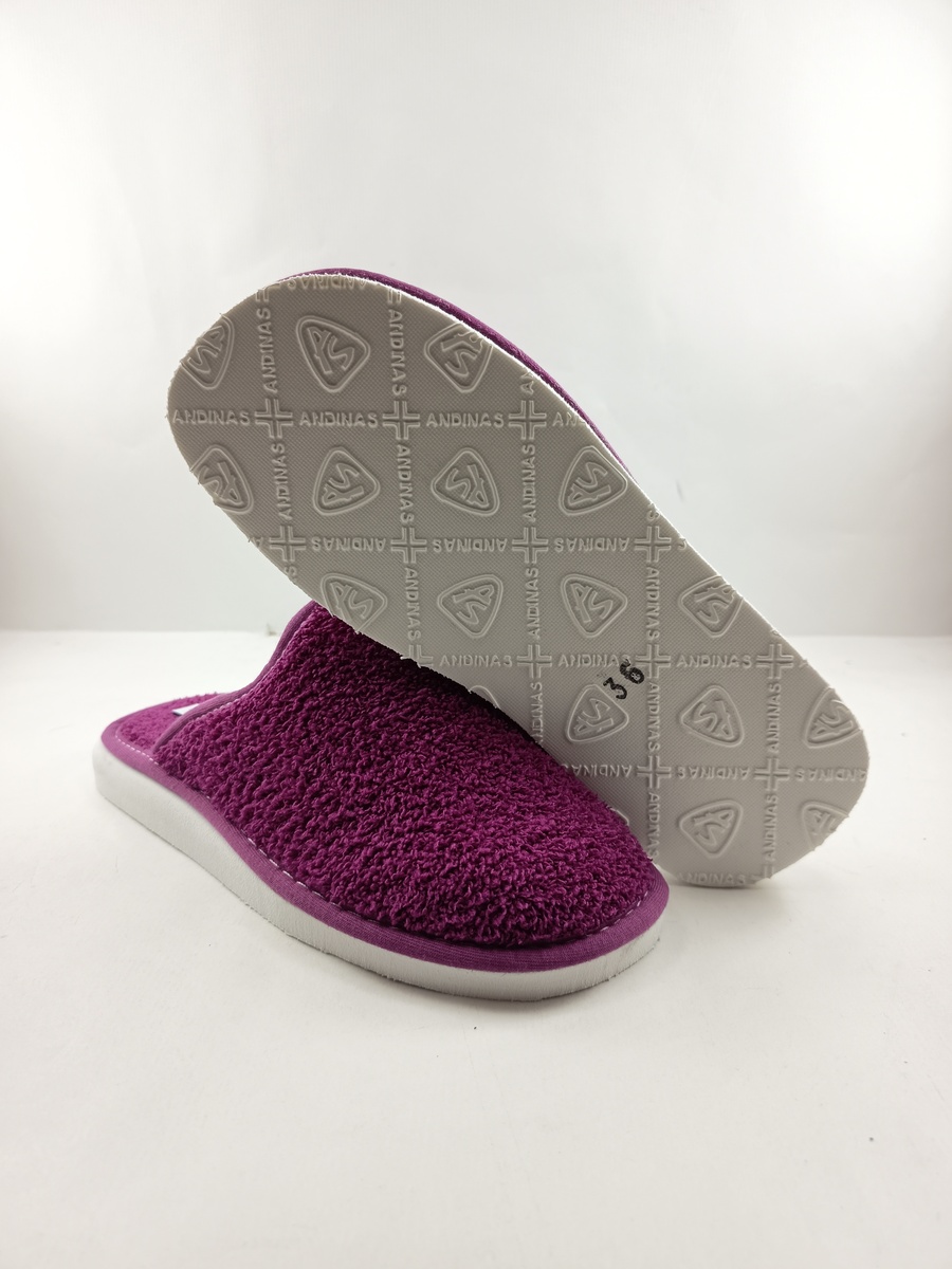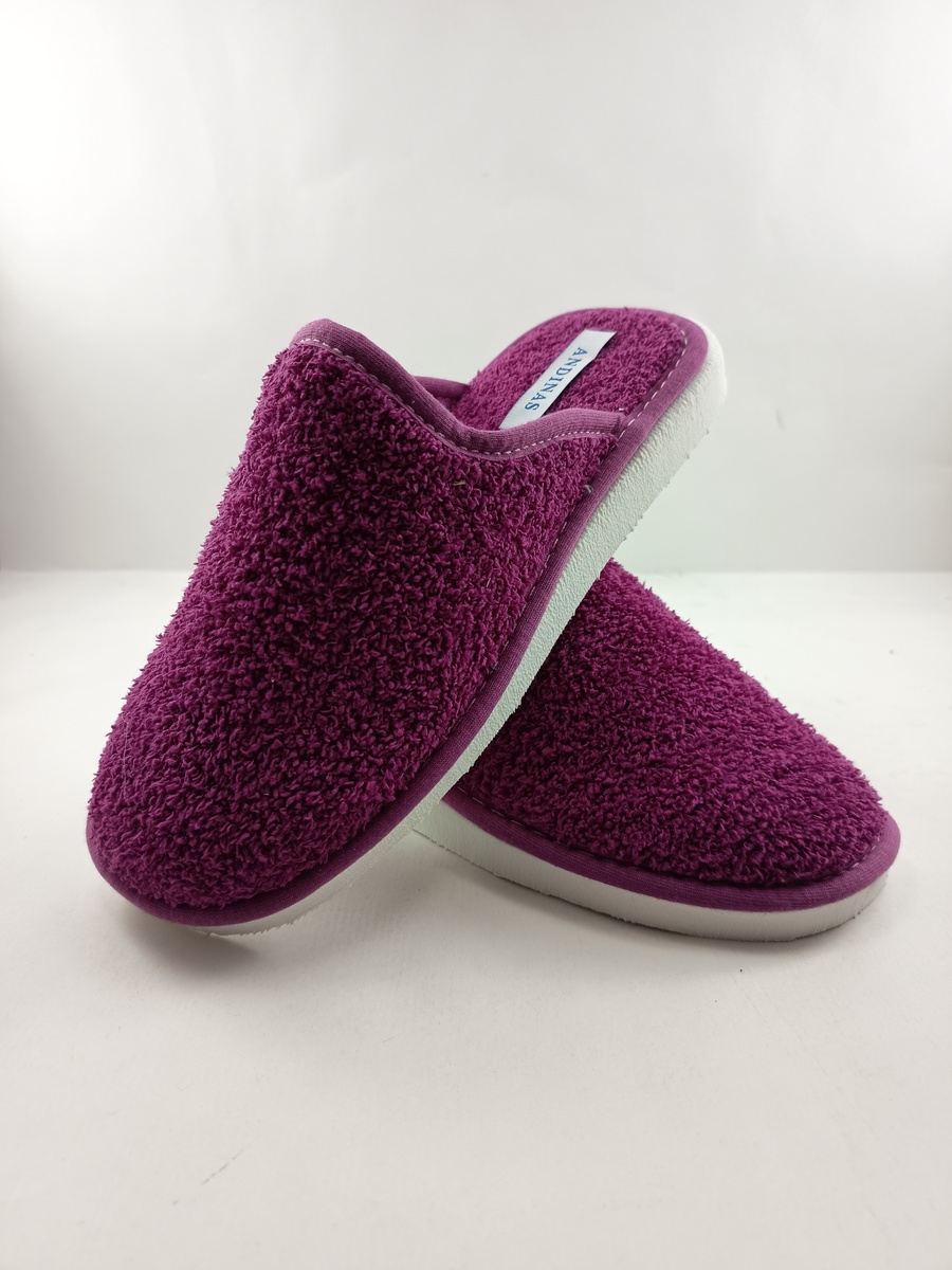Zapatilla de rizo en color magenta sin cierres y suela de goma, ligera y comoda.
