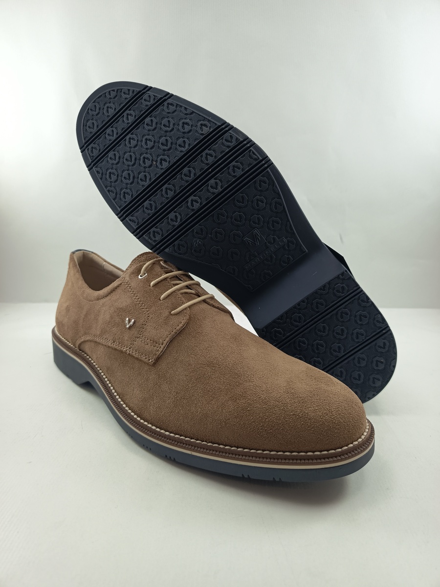 Zapato de vestir de ante camel con cierre de cordon y suela de goma, forro y plantilla de piel.