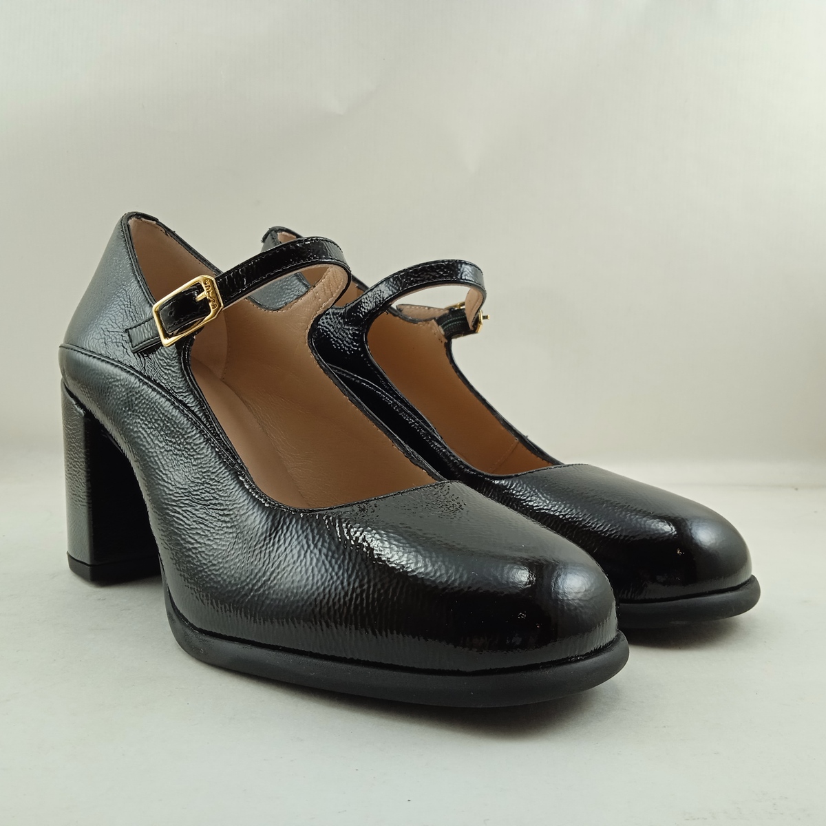 Zapato de vestir tipo mercedes negro de charol con cierre de hebilla en tobillo, tacon de 4cm.