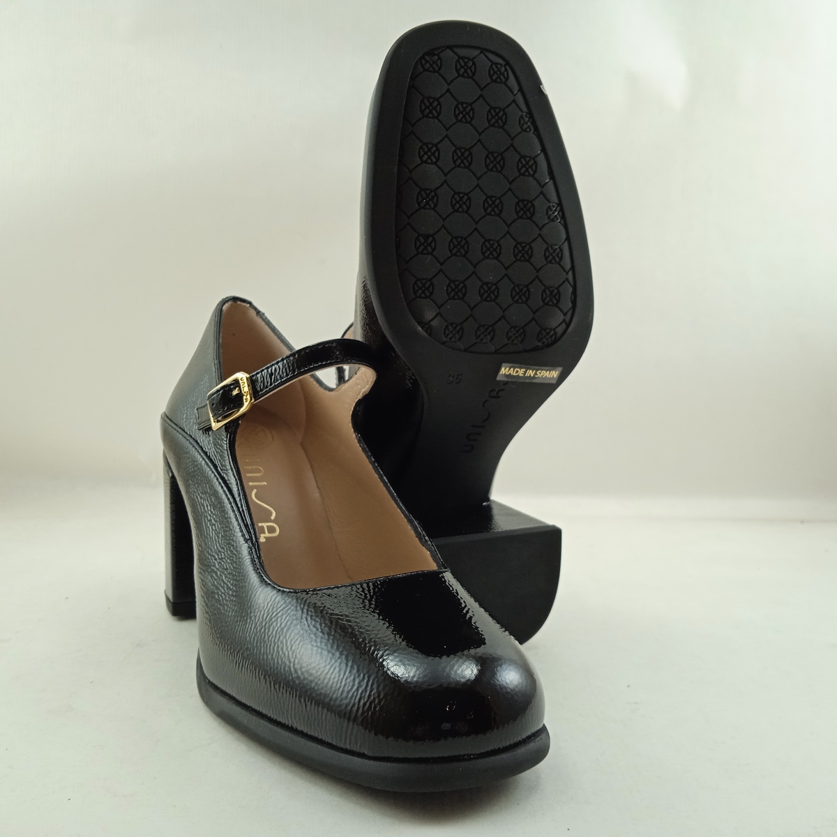Zapato de vestir tipo mercedes negro de charol con cierre de hebilla en tobillo, Unisa mod. Nayla
