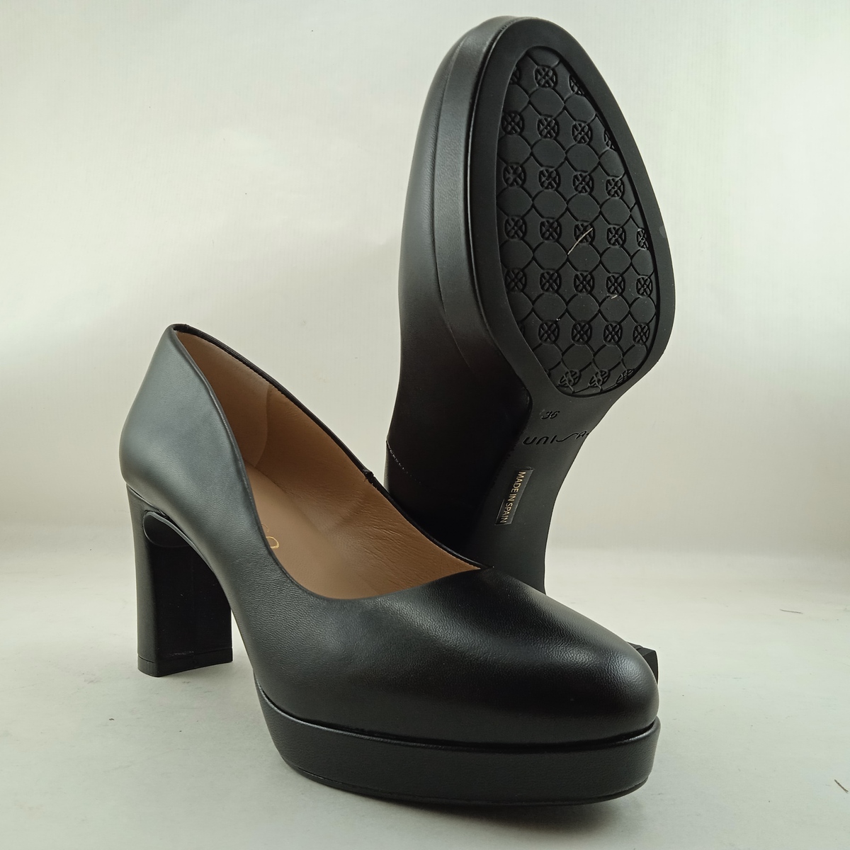 Zapato de vestir tipo salon negro sin cierres y suela de goma con tacon de 5cm y plataforma.