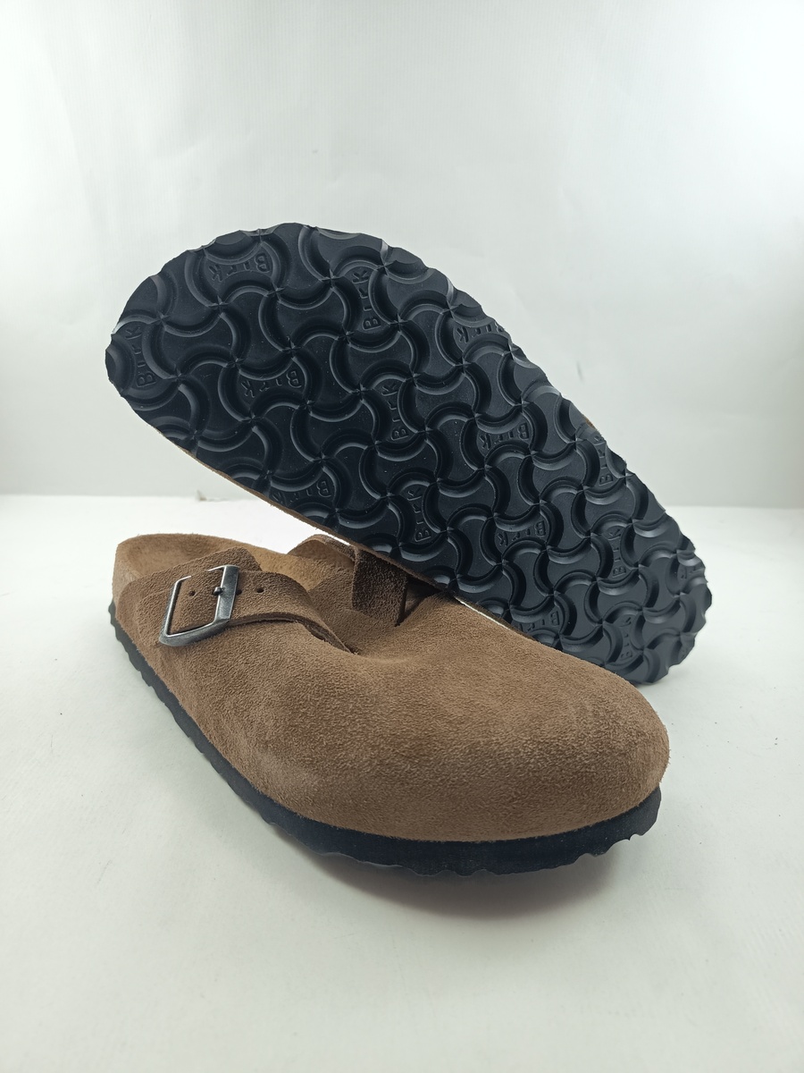 Zueco de piel marron sin cierres y suela de goma, forro y plantilla de piel, suela bio, comoda y ligera, detalle de hebilla ajustable en tobillo.