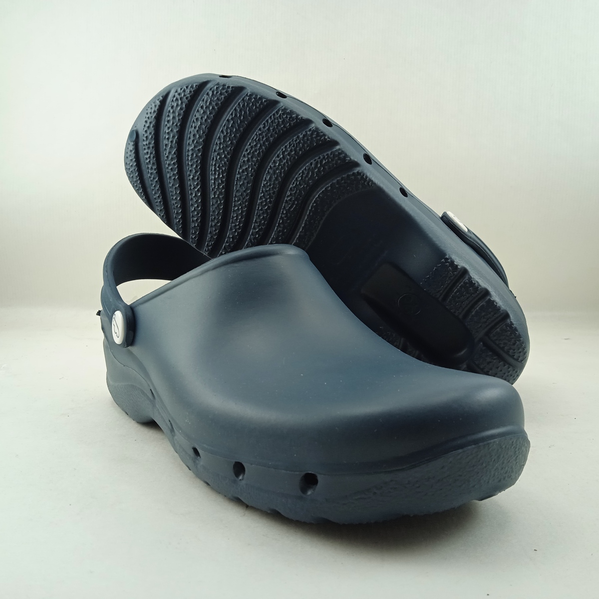 Zueco de trabajo azul marino con tira trasera y suela de goma, plantilla textil.