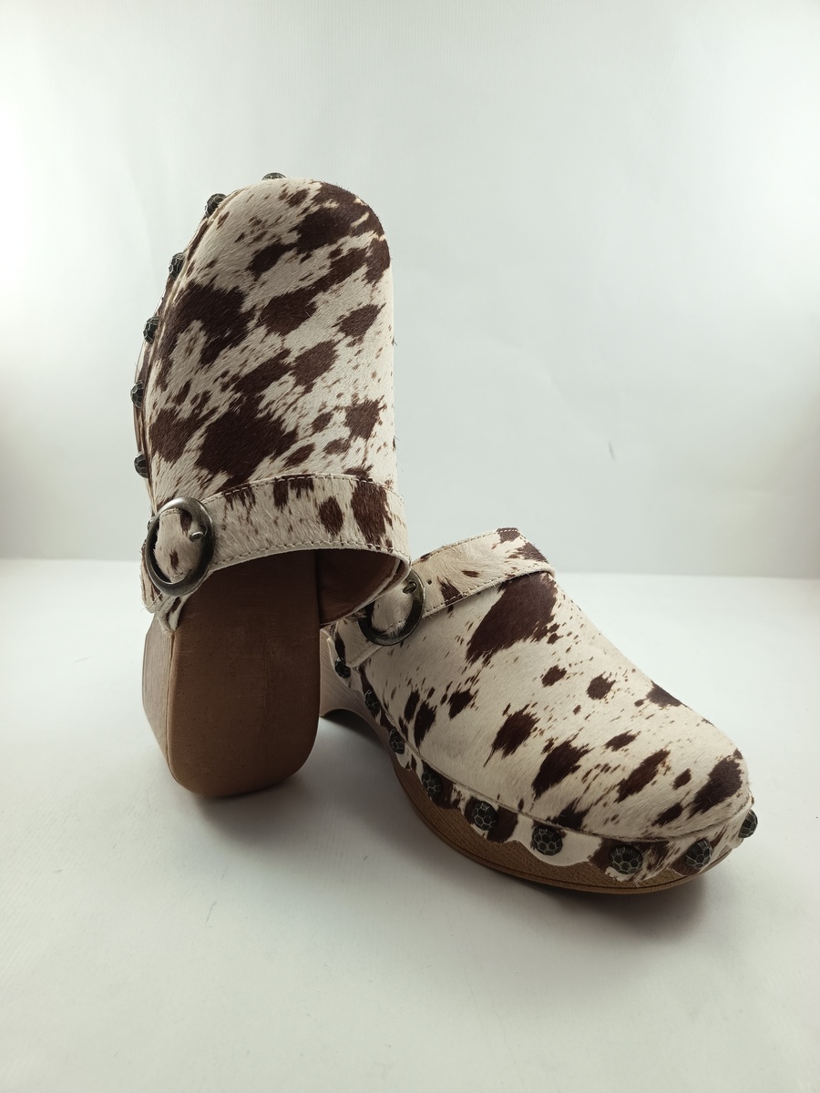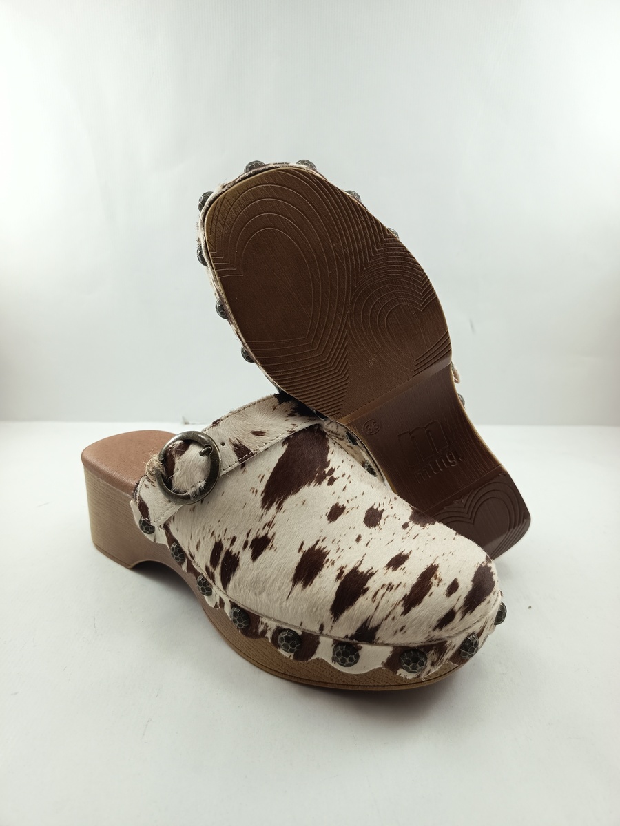 Zueco sintetico multicolor con cierre de hebilla y suela de goma con tacon de 2, forro y plantilla textil, detalle de animal print en el y vira en madera.