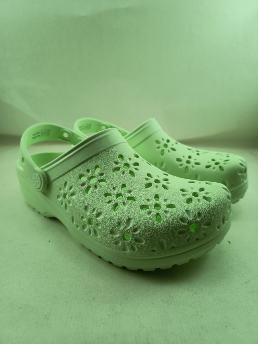 Crocs floral verde sin cierres y suela de goma, con tira trasera i detalle de flores caladas en todo ello.