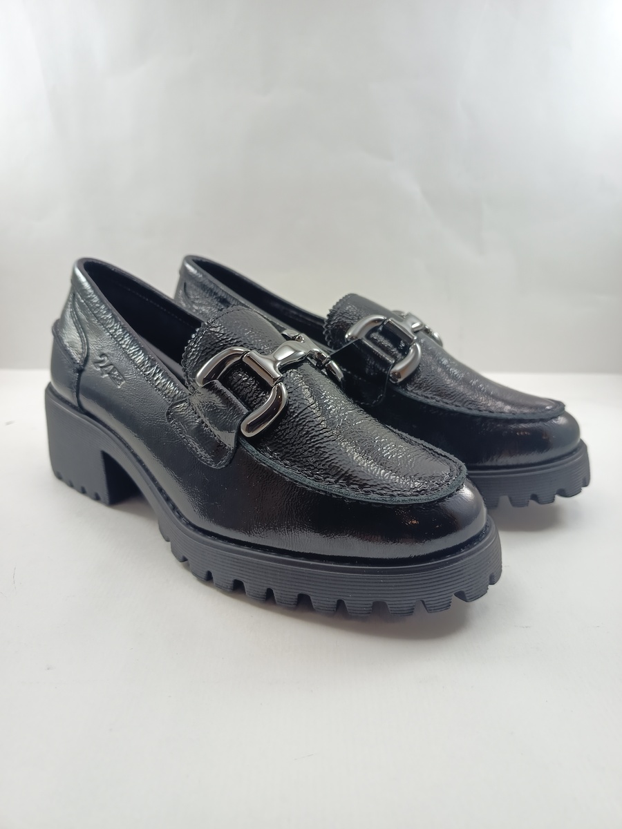 Mocasin de piel negra sin cierres y suela de goma con tacon de 2, forro y plantillla de piel, detalle de cadena en empeine.