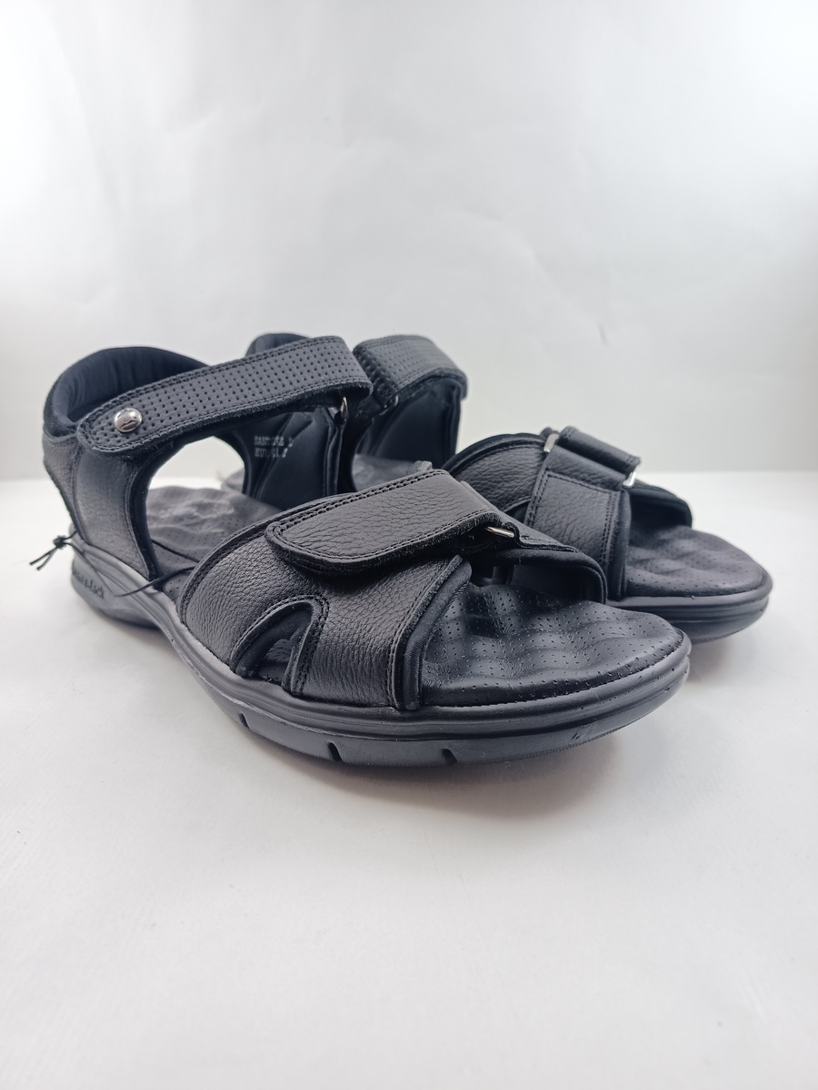 Sandalia de piel negra con cierre de velcros y suela de goma, forro y plantilla de piel, detalle de tira cruzada en dedos.