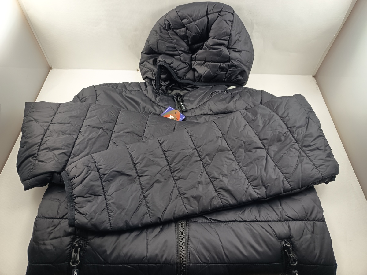 Chaqueta sintetica negra con cierre de cremallera y capucha.